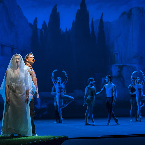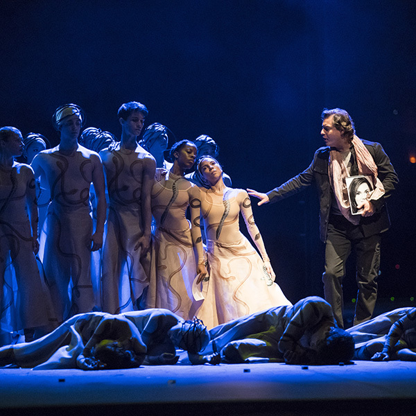 Traditionally the myth of Orpheus ends on a somber note, but Gluck’s Orphee et Eurydice ends triumphantly. Orphée and Eurydice are reunited and alive. This excerpt begins with Eurydice’s declaration of joy followed by the full chorus. The chorus performs the last sung music in the opera, but it is not the finale. The opera concludes with ballet.