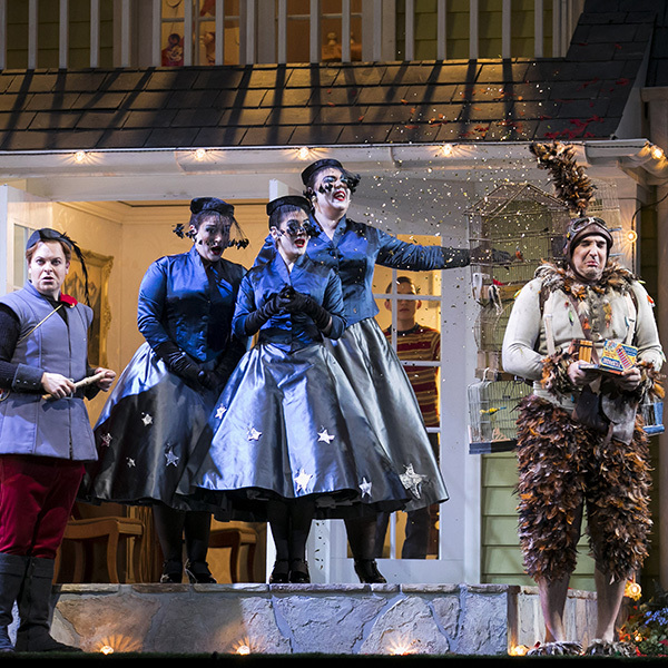 Papageno punctuates his aria with a five-note scale. It’s a birdcall he plays on an ancient folk instrument, the panpipes. Besides helping attract birds, that call is his musical trademark for the rest of the opera.