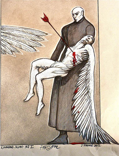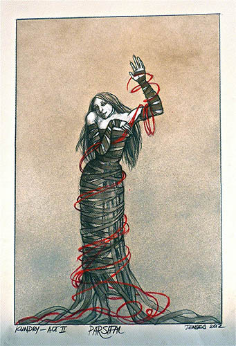 The sketches you were looking at were of some of the costumes from Lyric's production of Wagner's Parsifal (2013-14 season). Johan Engels, a native of South Africa, who created the sets as well as the costumes for that production, also designed the production of Weinberg's The Passenger that we presented in our 2014/15 season.