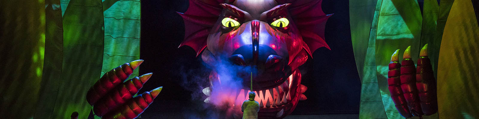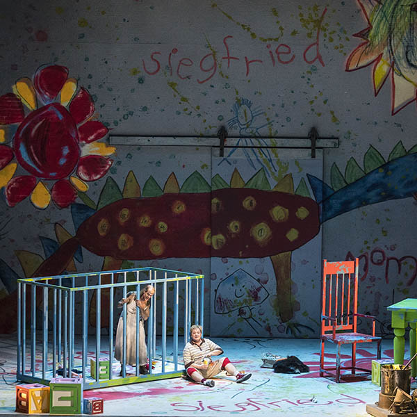 Siegfried, son of Siegmund and Sieglinde, has grown up – raised by the nasty dwarf, Mime. Siegfried forges anew the fragments of his father’s shattered sword, Nothung. Mime longs to have as his own the ring and the gold that are now guarded by the giant Fafner, who has now become a dragon. Siegfried manages to slay Fafner, taking with him the ring and the magic helmet (the Tarnhelm). Realizing that Mime intends to do him harm, Siegfried kills Mime. As the hero who knows no fear, Siegfried is able to penetrate the magic fire that surrounds Brünnhilde, who had been put to sleep as punishment by her father Wotan – she can be wakened only by a fearless hero. When Siegfried kisses her, she awakens as a mortal woman (no longer a goddess). The two fall ecstatically in love.