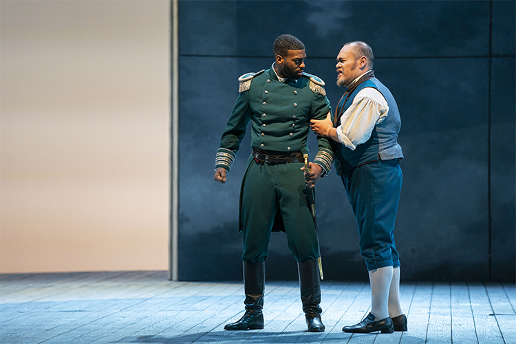 Soloman Howard in his Lyric debut as Wurm with Ryan Opera Center alumnus Quinn Kelsey (Miller) in the 2019/20 production of Verdi's Luisa Miller. (Photo: Todd Rosenberg)