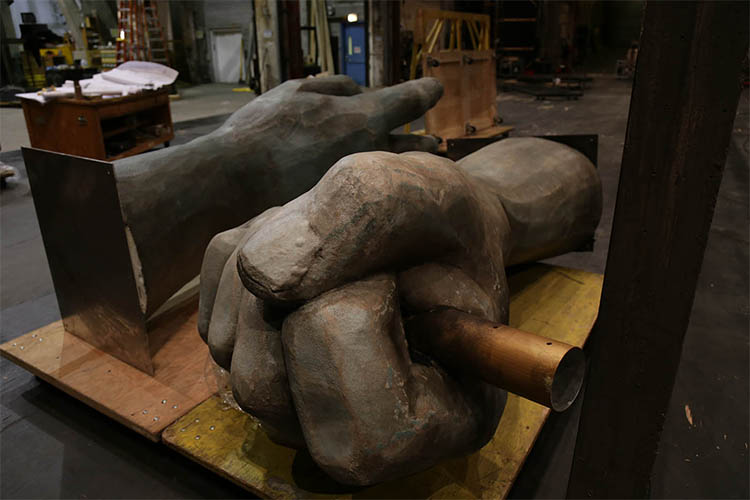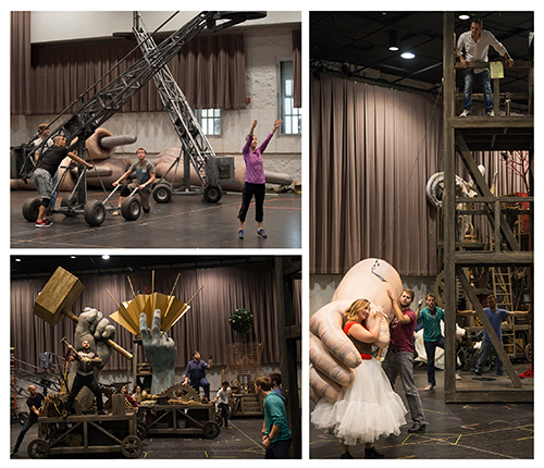 Next, we bring in the cast. Before the artists ever set foot onstage or sing with the full orchestra, they work extensively with Director David Pountney, choreographer Denni Sayers, and conductor Sir Andrew Davis in a backstage rehearsal room. The large space allows the silent actors to practice manipulating the lifts holding the three Rhinemaidens, the carts that serve as vehicles for the gods, and the large moving towers that will house the giants Fasolt and Fafner.