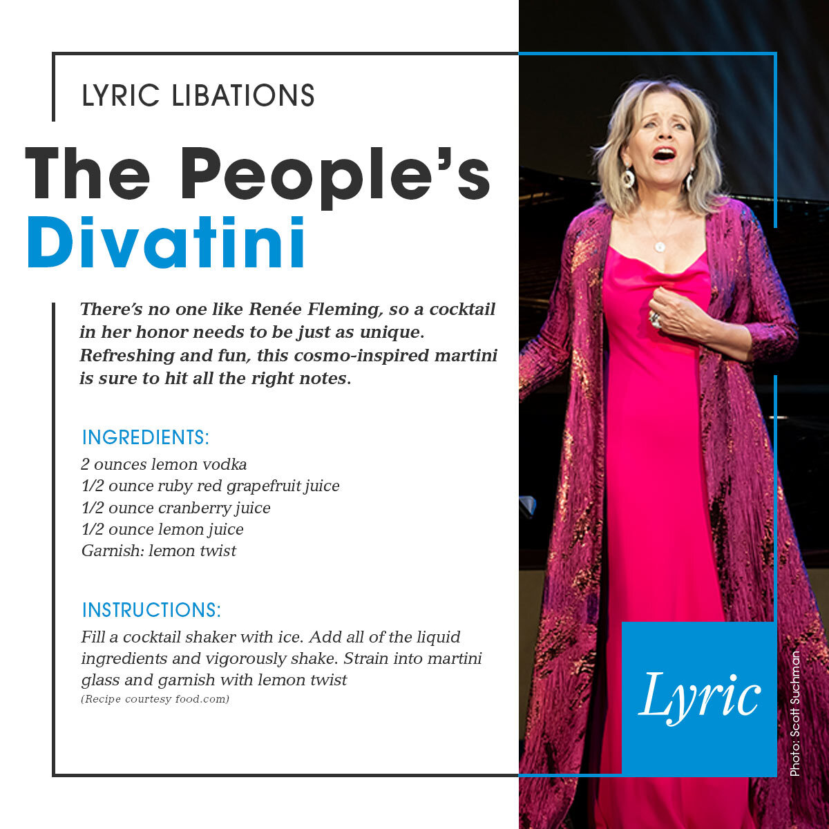 There’s no one like Renée Fleming, so a cocktail in her honor needs to be just as unique. Refreshing and fun, this cosmo-inspired martini is sure to hit all the right notes.