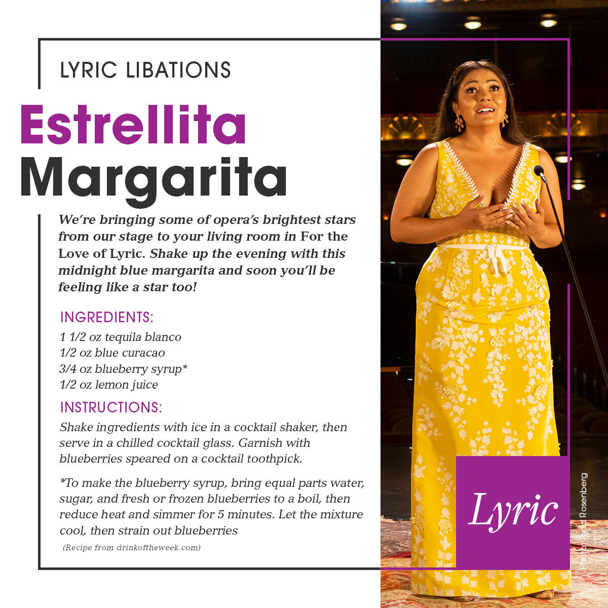 We’re bringing some of opera’s brightest stars from our stage to your living room in For the Love of Lyric. Shake up the evening with this midnight blue margarita and soon you’ll be feeling like a star too!