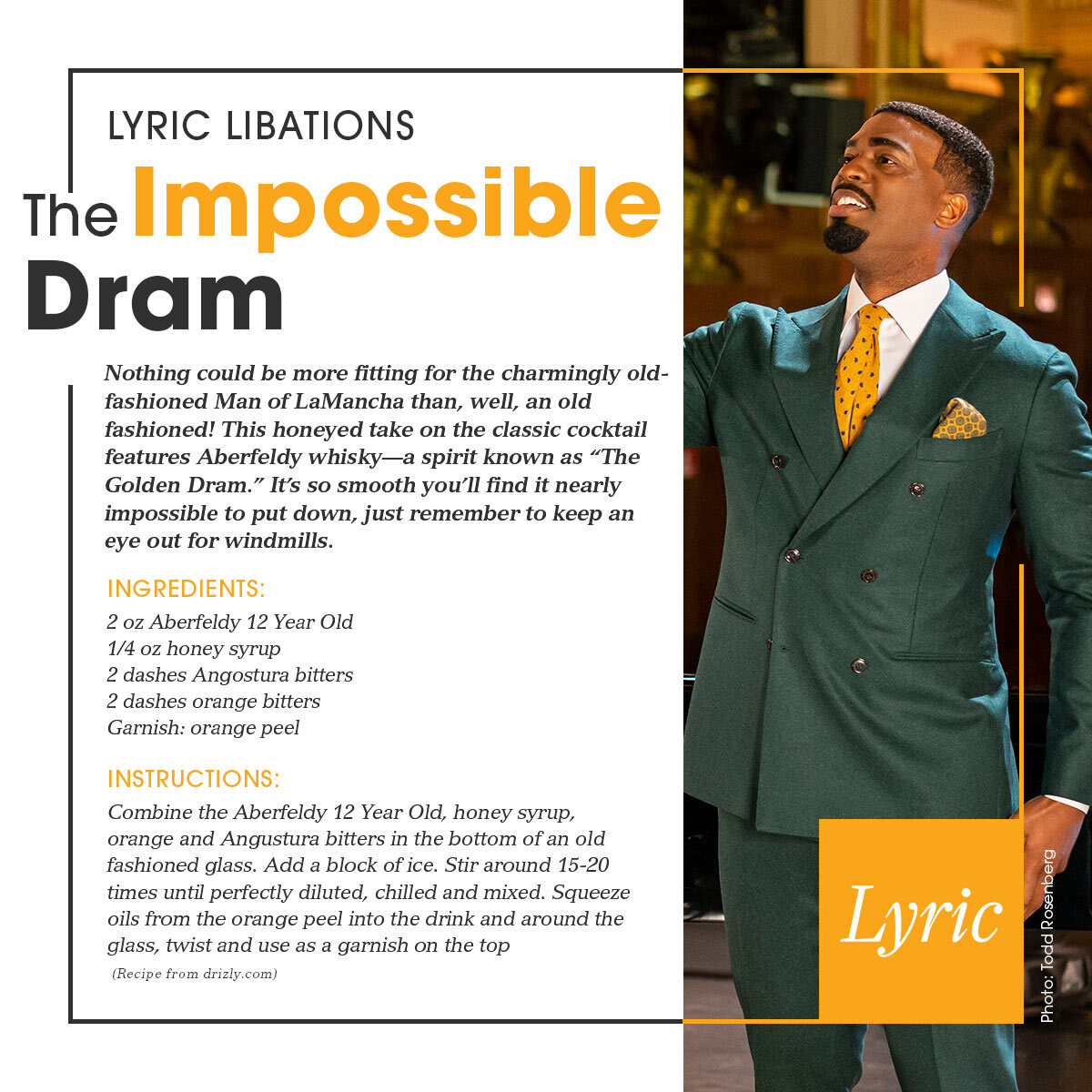 Nothing could be more fitting for the charmingly old-fashioned Man of LaMancha than, well, an old fashioned! This honeyed take on the classic cocktail features Aberfeldy whisky—a spirit known as “The Golden Dram.” It’s so smooth you’ll find it nearly impossible to put down, just remember to keep an eye out for windmills.