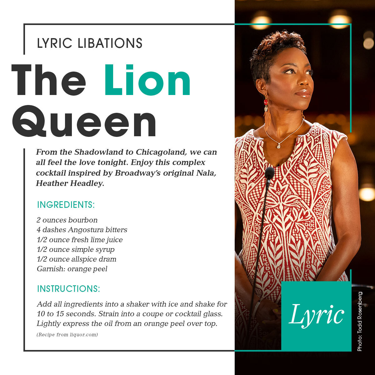 From the Shadowland to Chicagoland, we can all feel the love tonight. Enjoy this complex cocktail inspired by Broadway’s original Nala, Heather Headley.