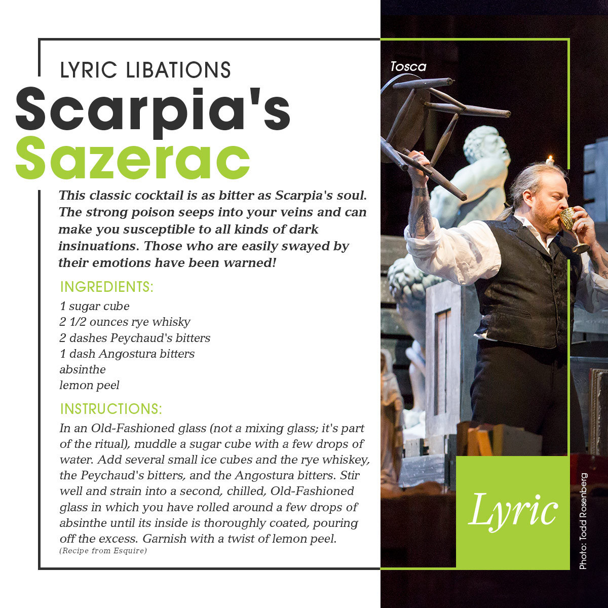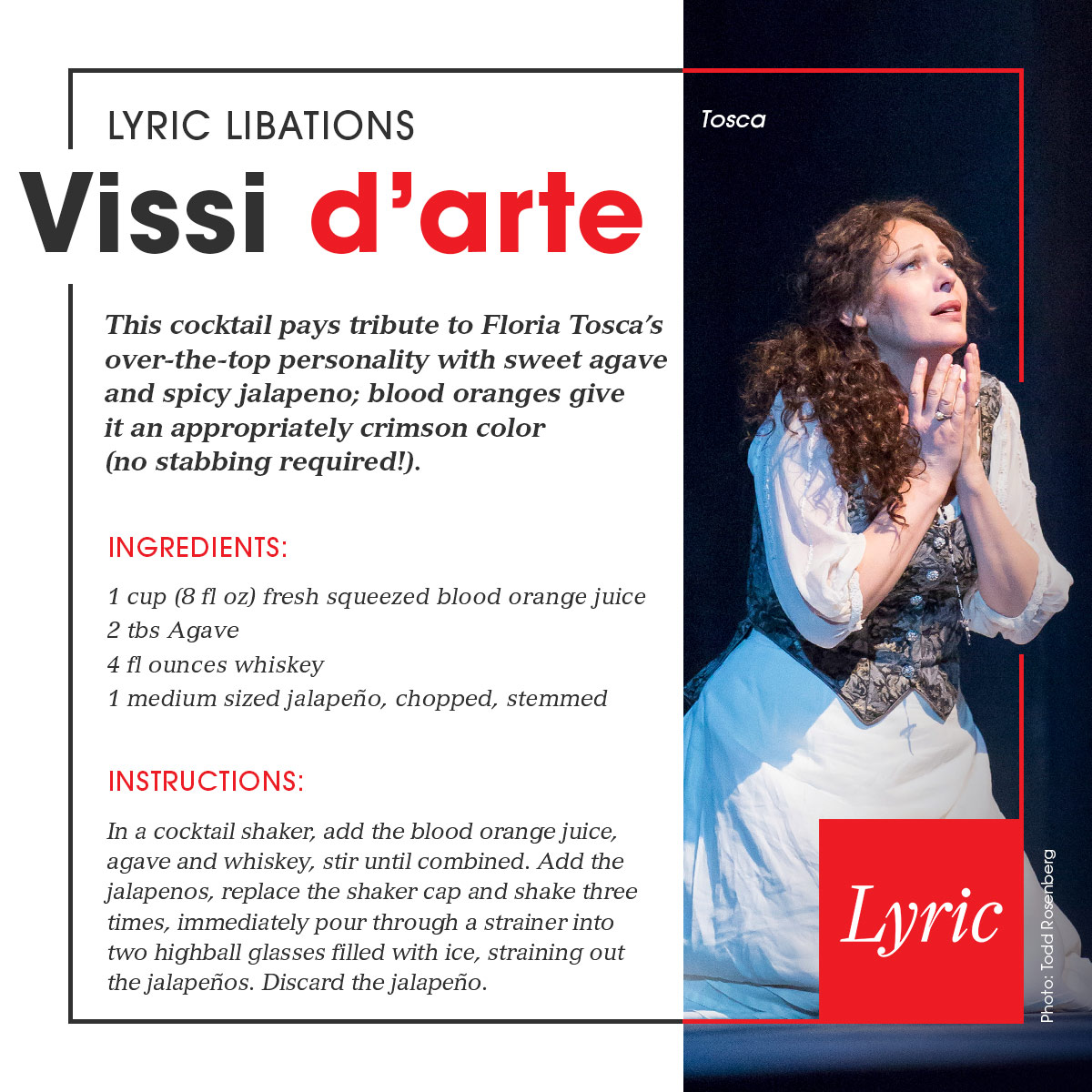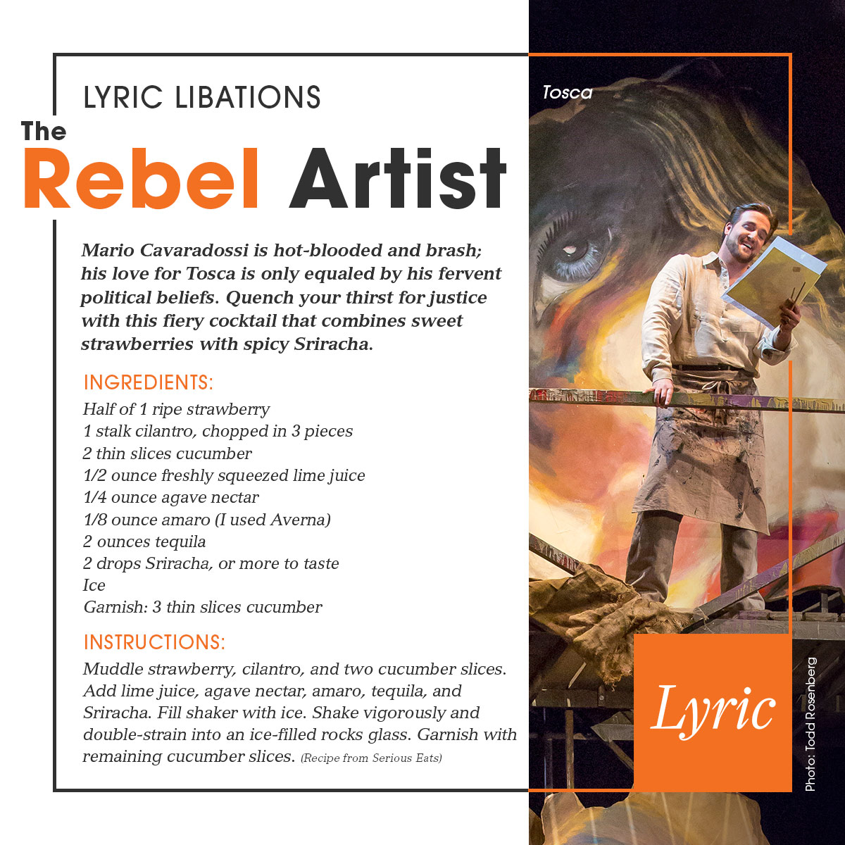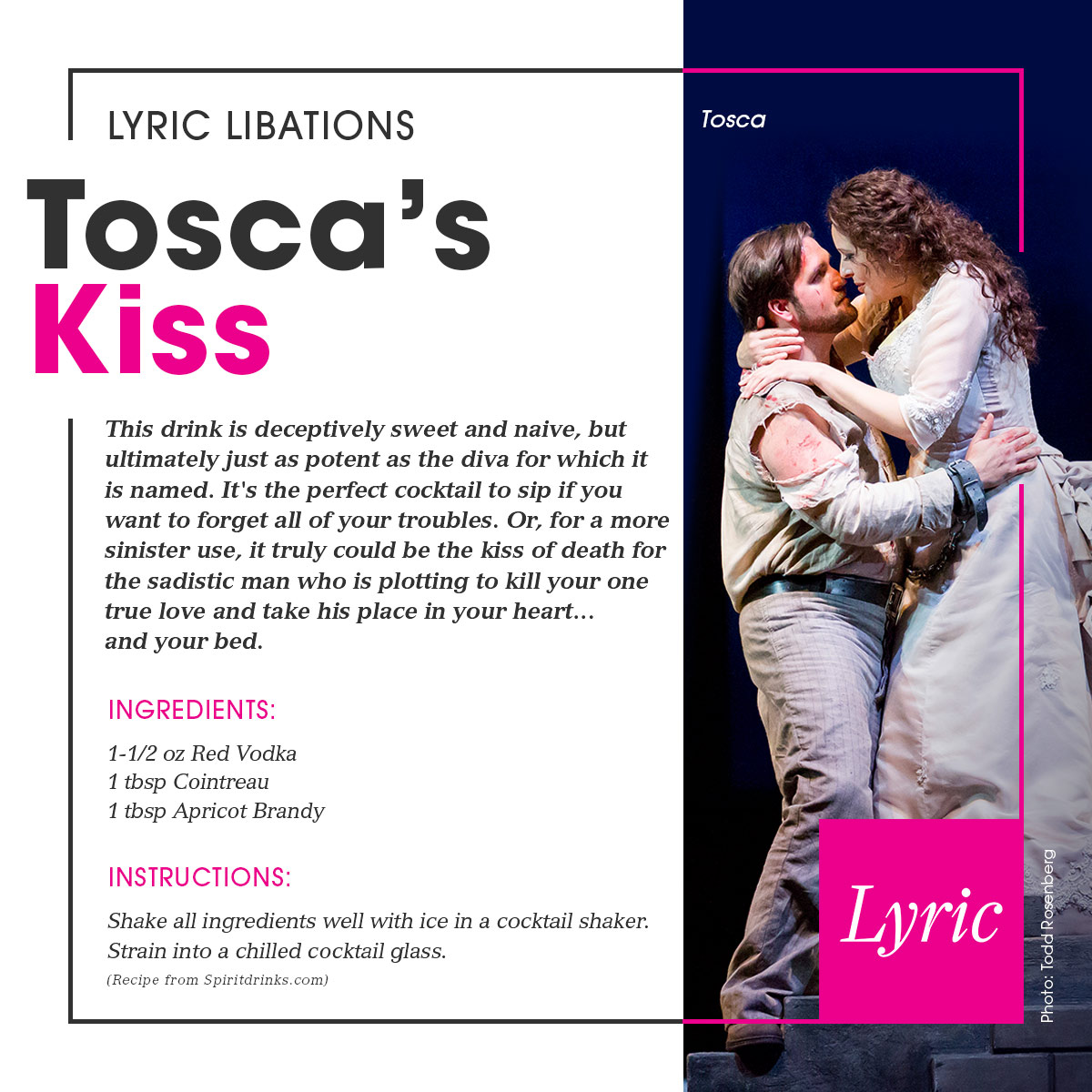 Love. Jealousy. Revolution. Death. It all can be found in Puccini's Tosca. Three characters—the rebel, the diva, and the villain—are caught a game of cat-and-mouse with deadly consequences. Non-stop drama could require a cocktail (or three) to unwind. Pick your favorite!