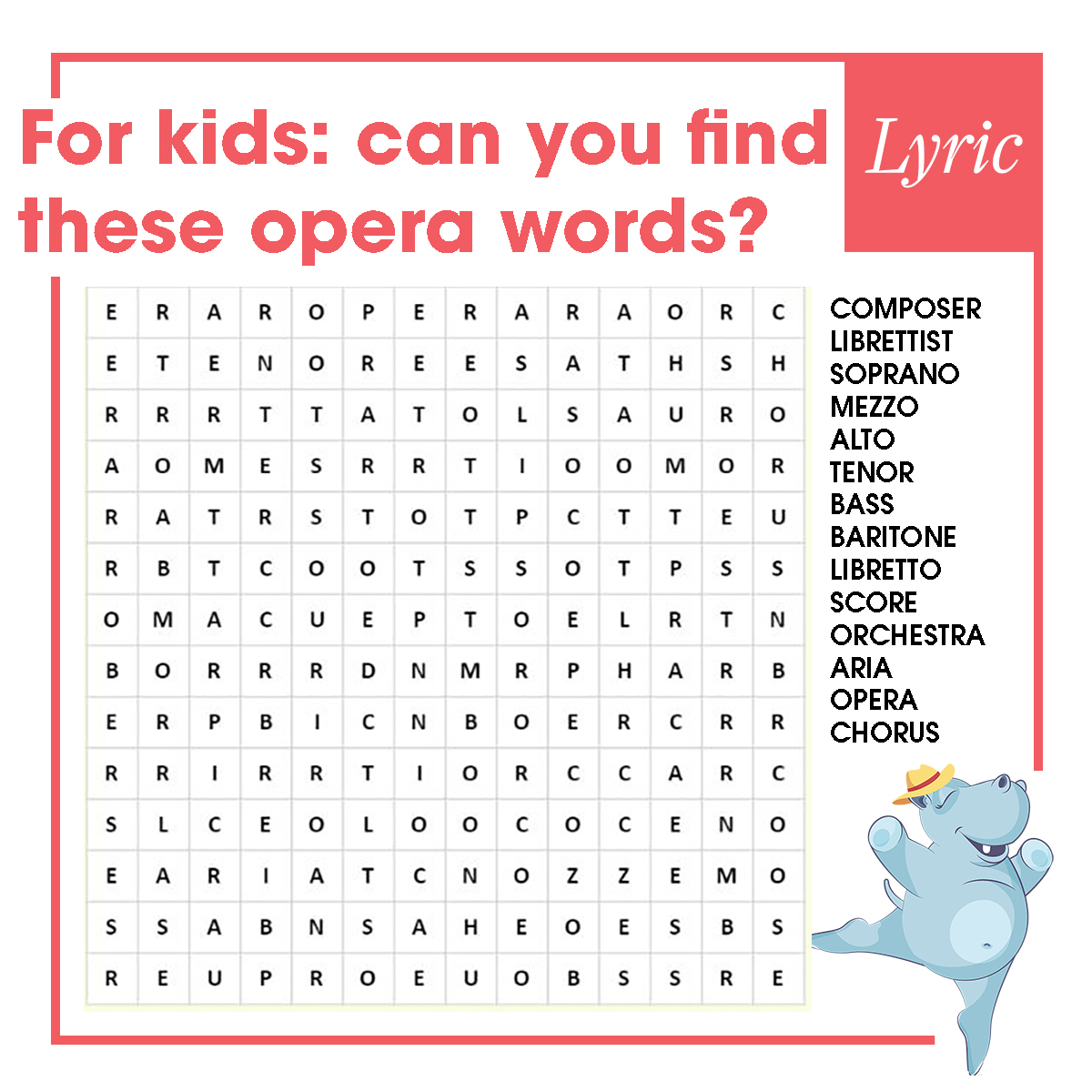 Do you like puzzles as much as we do? For the grown-ups: See if you can spot the differences between these two photos of Lyric Music Director Sir Andrew Davis! And if you’re looking for an amusement for young people in your life, share this kid-friendly word search!
