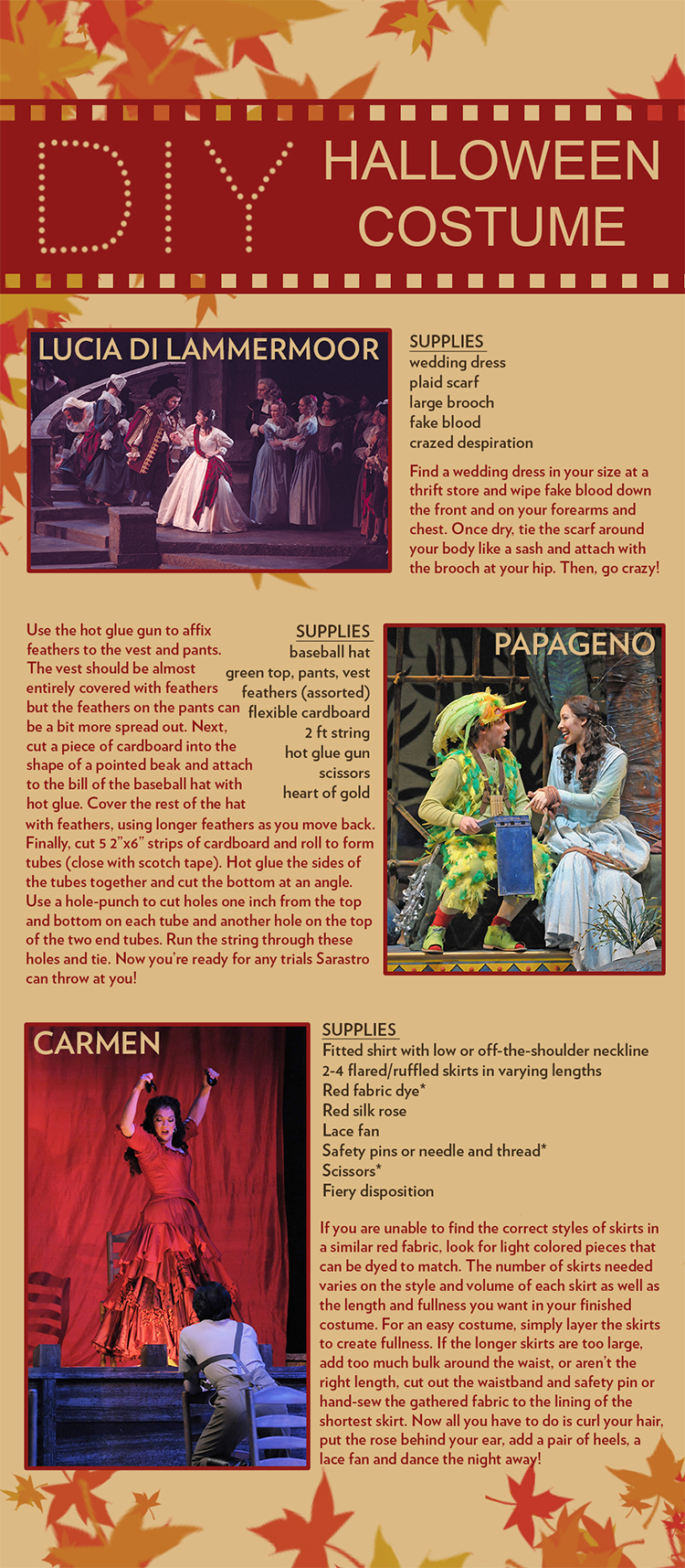 This Halloween, unleash your inner diva--or divo--by dressing as your favorite opera character! Here are three simple DIY costumes inspired by Lyric's 2016/17 season. Looking for even more inspiration? Check out some of our favorite costumes on Pinterest.
