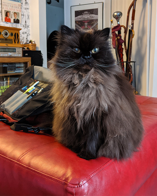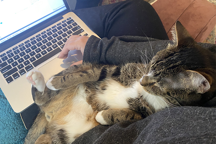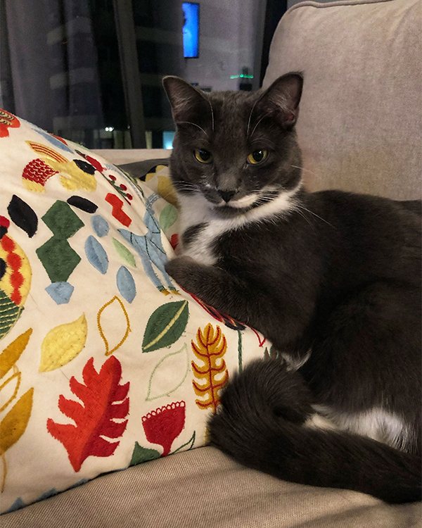 "He had us at mustache! We rescued our kitty after finding out he was abandoned at a gas station during the 2017 polar vortex. He’s the newest star in our (proudly) geeky household, so we named him Nova Quark. He and our 5-year-old are best friends and enjoy chasing each other and playing fetch. I have no doubt he is enjoying this “coronacation” and having his humans home for unlimited cuddles and treats for days! He’s made his first conference call appearance and I’m sure everyone will be seeing more of him."