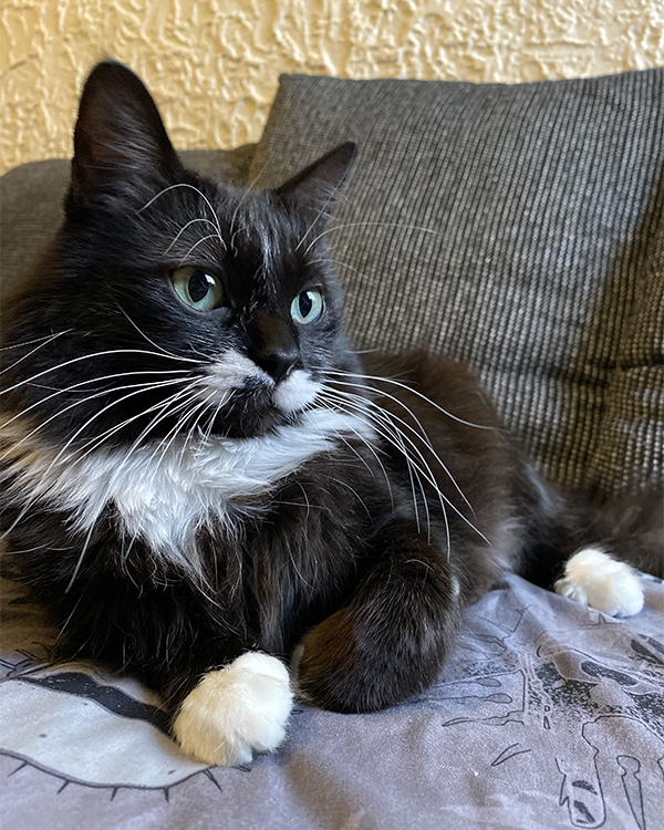 "Spooky was adopted from the Naperville Humane Society, where she had to be isolated from the other cats for "being a diva" and "hitting people in the face." When she's not sitting on the keyboard hard at work, she can be found chasing hair ties and drinking directly from the sink."
