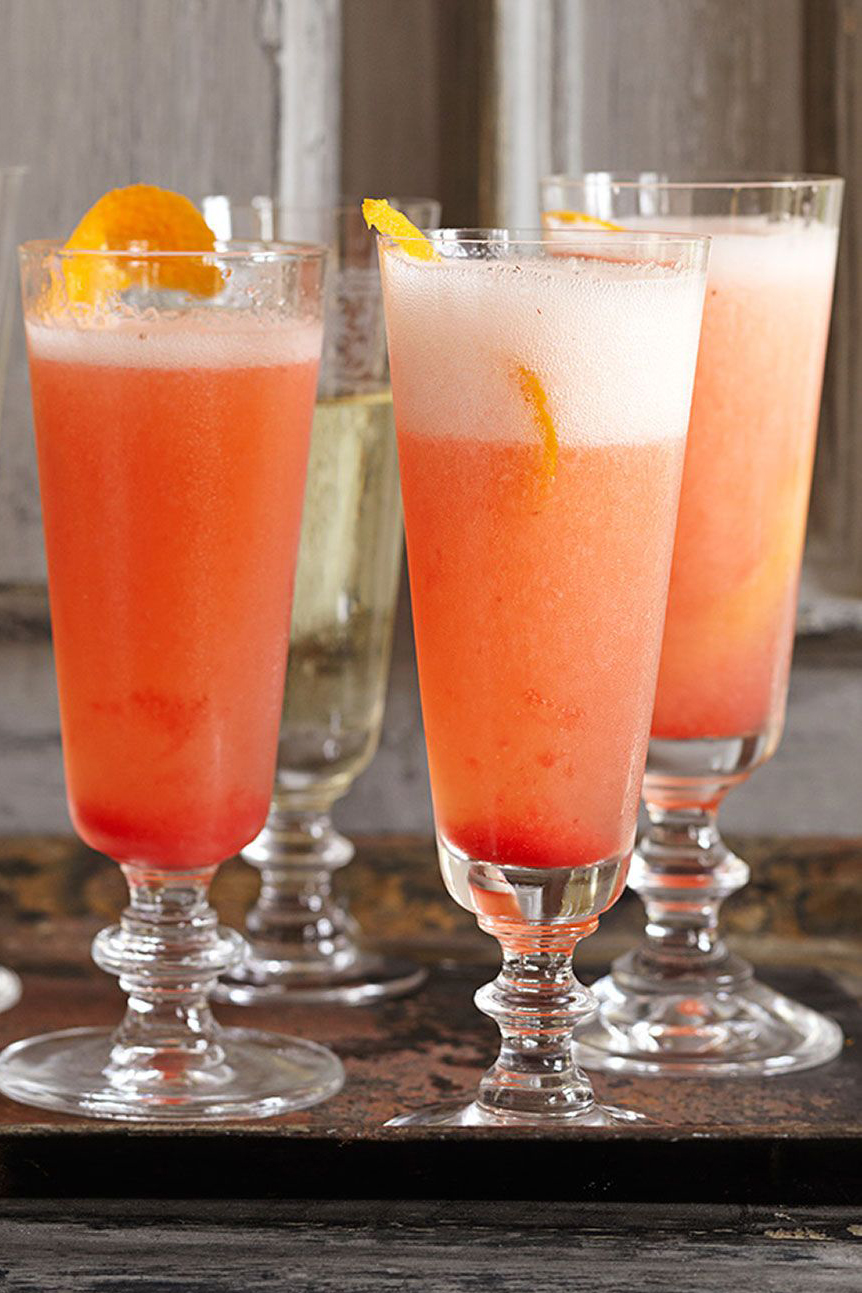 When ready to serve, rub the rim of each Champagne glass with the orange zest. Pour the cold Prosecco into Champagne glasses until they're each three-quarters full. Carefully stir 2 tablespoons of the puree into each glass and serve very cold. (Makes 6-7 drinks)