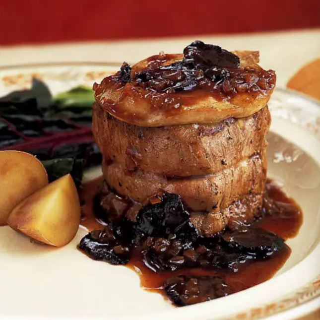 To serve, remove any strings from the beef medallions. Place the beef on warmed plates or a platter. Top with the foie gras and nap with the sauce, making sure that a couple slices of truffles rest on each serving of foie gras. Serve immediately.
