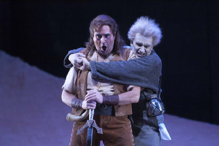 Once Siegfried slays the slow-moving Fafner (who resembles an aging heavyweight fighter who hasn’t faced a legitimate challenge in years), the forest sounds as liberated as Berlin did the night the Wall fell. The Woodbird sings with great joy that Siegfried “will own the Nibelung hoard…and if he desires to find the Ring, it will make him ruler of the whole world.” And the Woodbird’s advice for Siegfried to beware of Mime sets up perhaps the most inventive musical sequence of the act: Mime’s words, which have been accompanied by a scherzo-like tempo reminiscent of Schubert’s “Death and the Maiden” string quartet, turn much slower, as if allowing Siegfried to ascertain their true meaning. Mime is toast.
