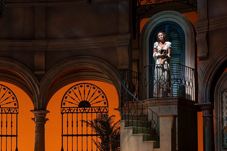In this scene, Rosina (Marianne Crebassa) has heard a voice serenading her – it was Lindoro, the young man she loves. She anticipates that he will be hers, and then proclaims that, if anyone interferes, she knows 100 tricks to get her way.