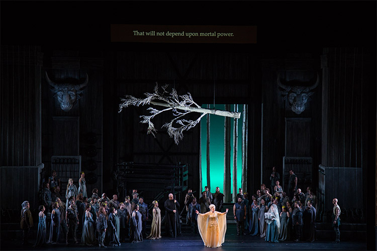 The Chicago Sun-Times calls the production “elegant” and “visually intriguing,” praising the “superb singing by both its soloists and chorus,” and the orchestral playing “impeccably conducted by Riccardo Frizza….Among the most moving moments are the intimate ones, particularly those in which Norma recalls the ecstasy of her initial love for Pollione, and later joins voices with Adalgisa in an act of feminine bonding….[Radvanovsky] is a thoughtful, graceful actress, and when she blends voices with DeShong, whose powerful mezzo never wavers…the notion of bel canto is very much alive....[and] absolutely sublime….The handsome set design…is the work of David Korins, who also created the world of Hamilton. It confirms him as an artist…who in this case can conjure a pagan world with a certain magic born of a grove of towering silver and gold tree trunks, the most delicate snowfall and a giant mythic bull (all masterfully lit by Duane Schuler).”