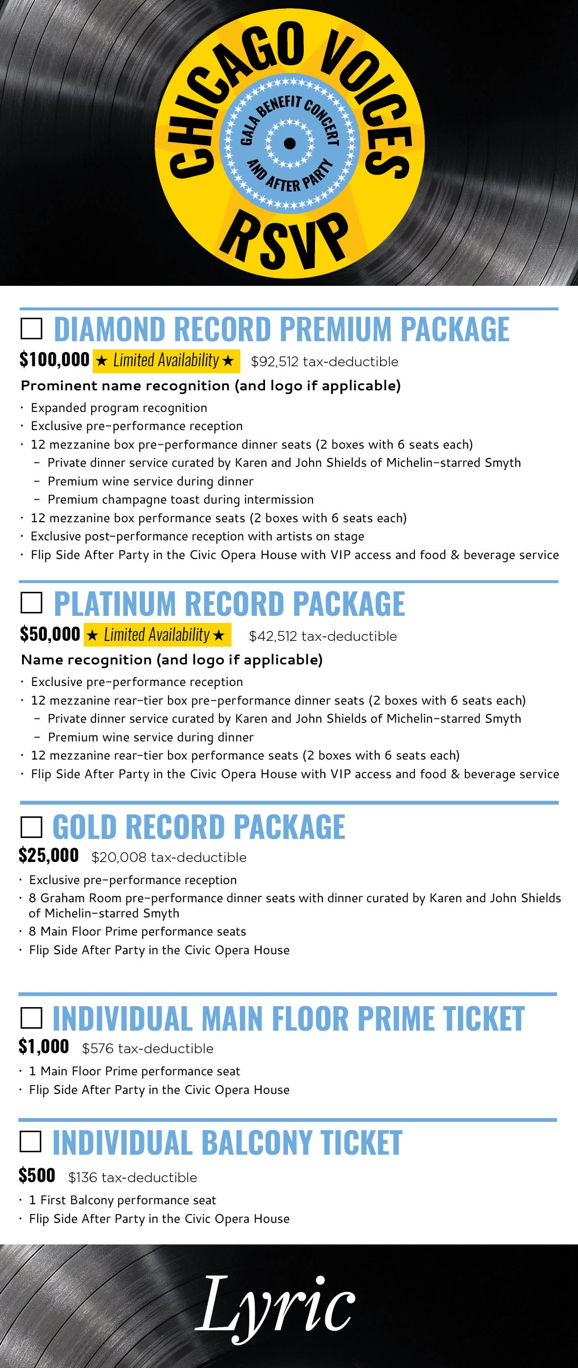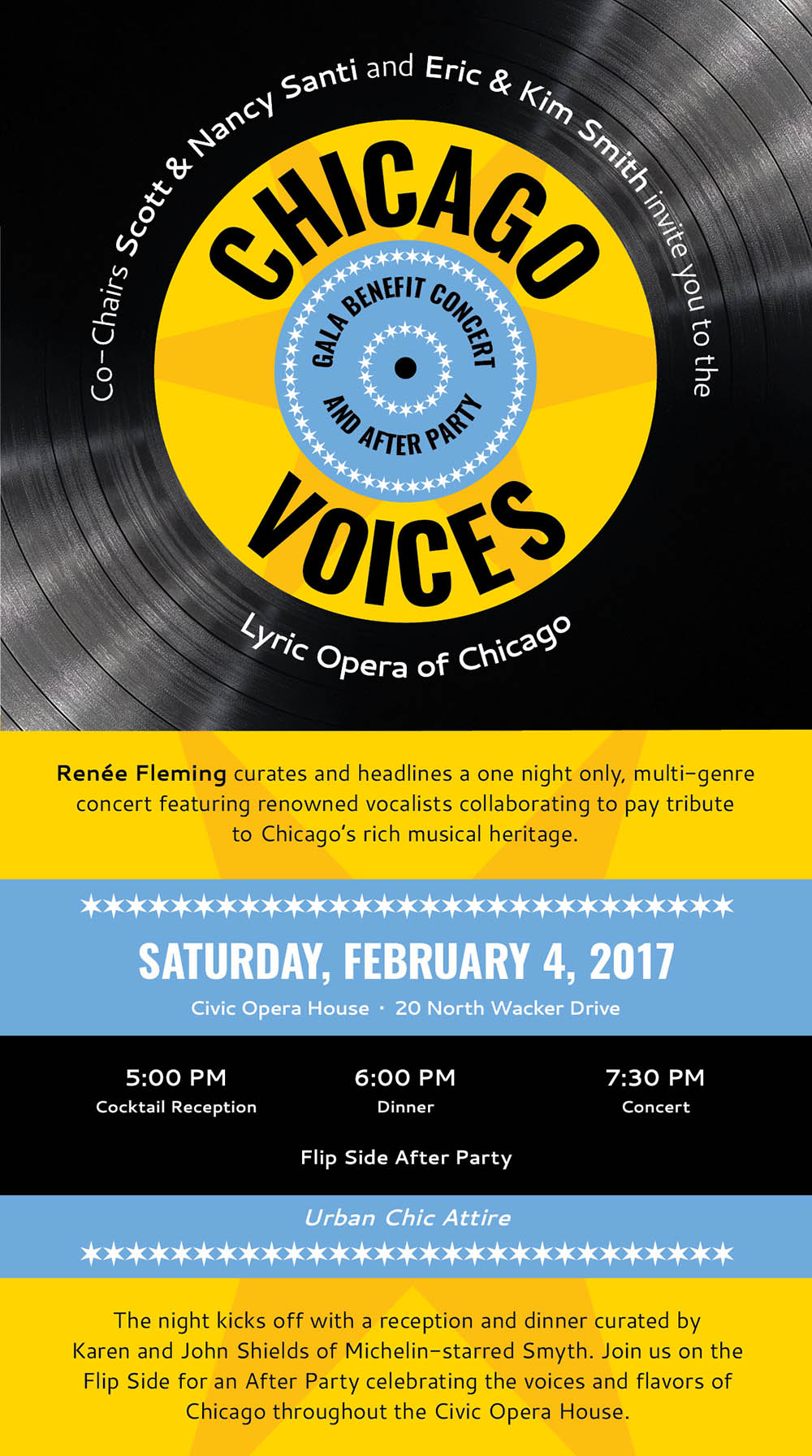 This unique, eclectic performance is sure to be one of the highlights of Chicago’s cultural season! Join us for the Chicago Voices Concert and celebrate the glory of the human voice in its many styles. The Benefit Concert and After Party is hosted by Lyric’s Board of Directors and Women’s Board, co-chaired by Scott & Nancy Santi and Eric & Kim Smith. Premium package patrons will celebrate all night long in the Civic Opera House with a pre-concert reception, dinner curated by Chefs Karen and John Shields of Smyth + The Loyalist, and the Flip Side After Party celebrating the sights, sounds, and tastes of Chicago through a "street fest" ambiance — experience Lyric as never before! Urban Chic attire encouraged. Packages start at $25,000, and Individual Reservations ranging from $500-1,000 include tickets to both the concert and Flip Side After Party. For more information, please call the Women's Board Office at 312.827.5682 or email wboffice@lyricopera.org.