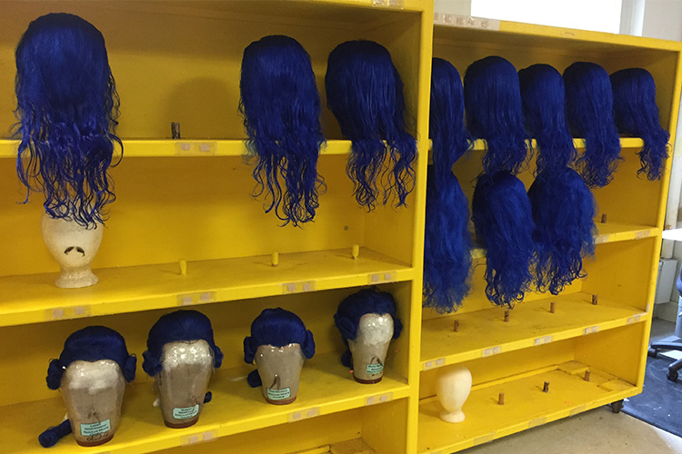 These cotton-candy-esque confections, a good two feet tall, were constructed in Houston, Sarah explains, with lightweight hard-foam structures to keep them firmly vertical. (There’s not enough hairspray in the world to do that without a solid infrastructure.) Diana and Annie love their outlandish locks and can’t wait to show them off. As Annie says of her shocking pink wig, “It’s amazing! I don’t fully understand my character till I wear what she wears.”