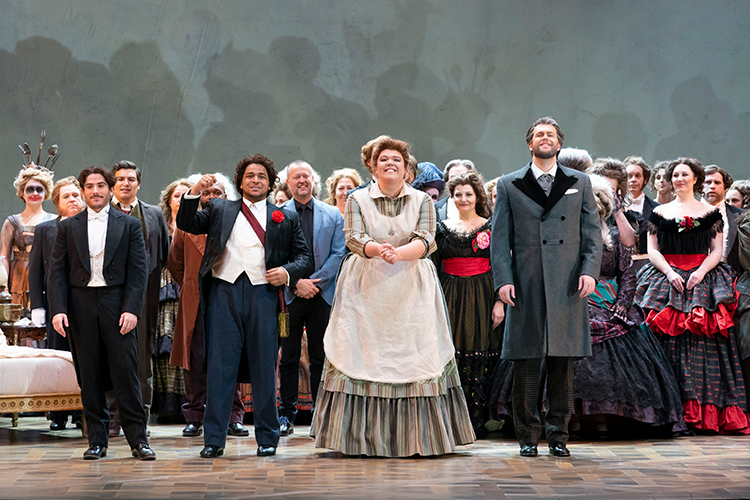 Ryan Opera Center members (Mario Rojas, Christopher Kenney, Lauren Decker, and David Weigel) bowing after Lyric's 2018/19 production of La traviata
