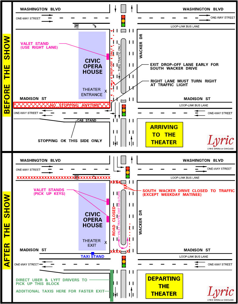 Taxi Users: Lyric Opera taxi stand will remain the same and patrons should continue to use the Madison Street theater exit and line up in the lobby. Additional taxis will be waiting on Wacker Drive just south of Madison Street if you desire a quicker departure.