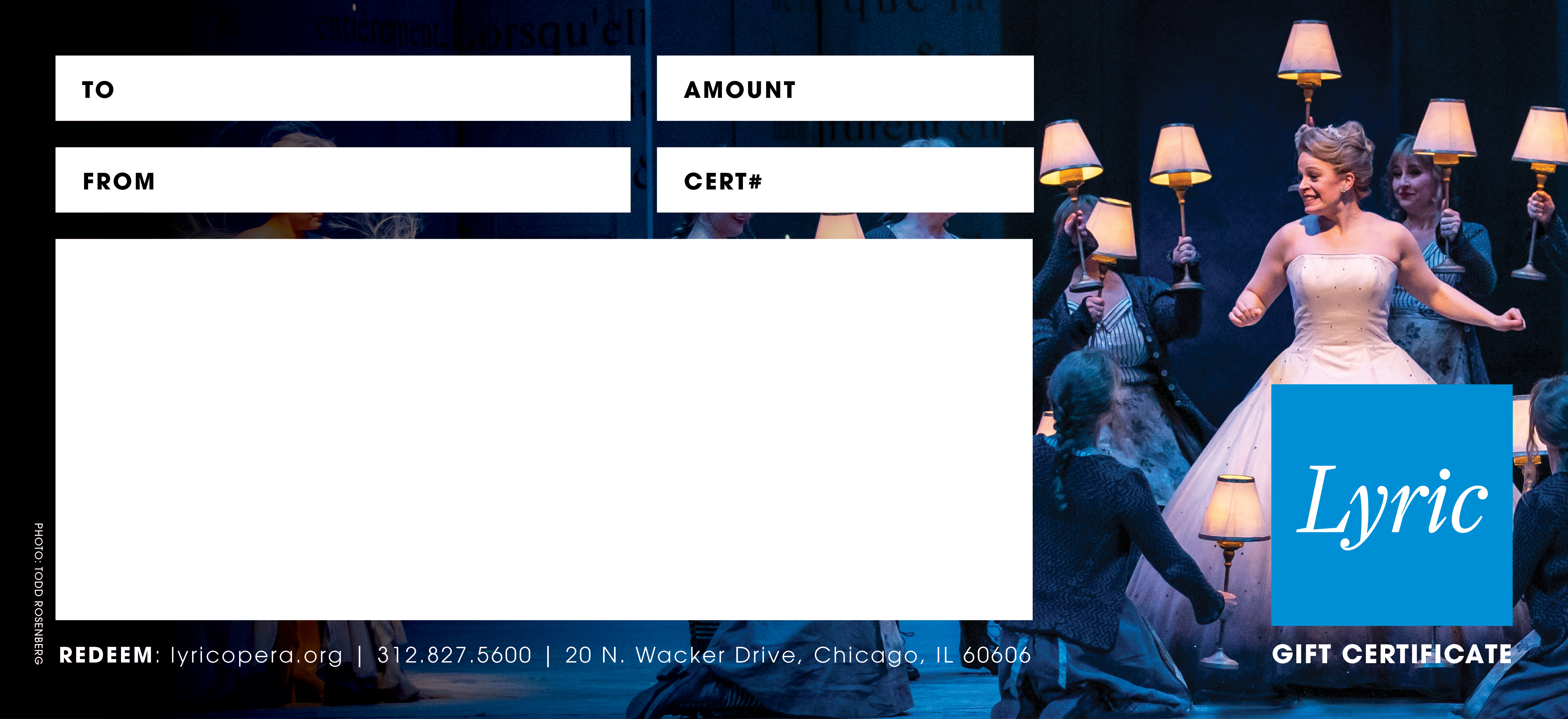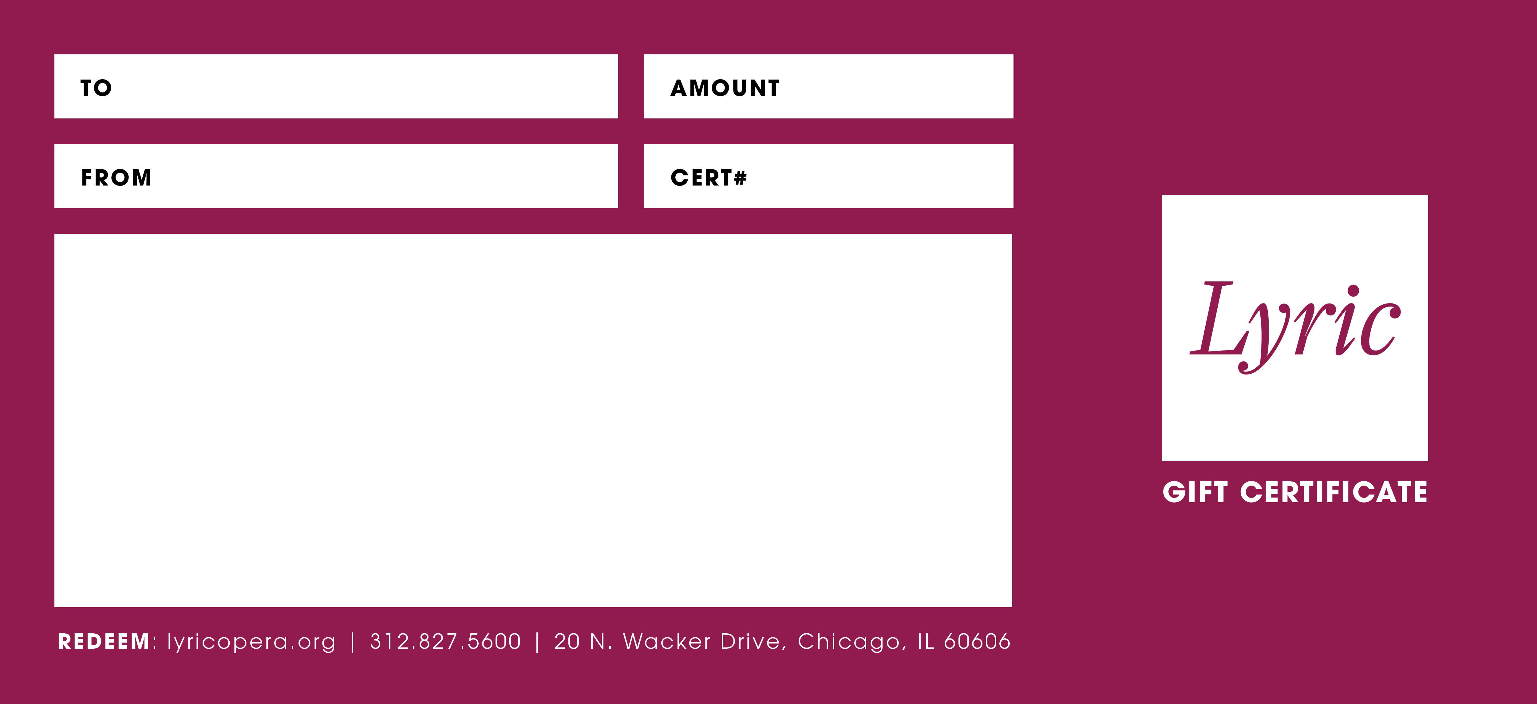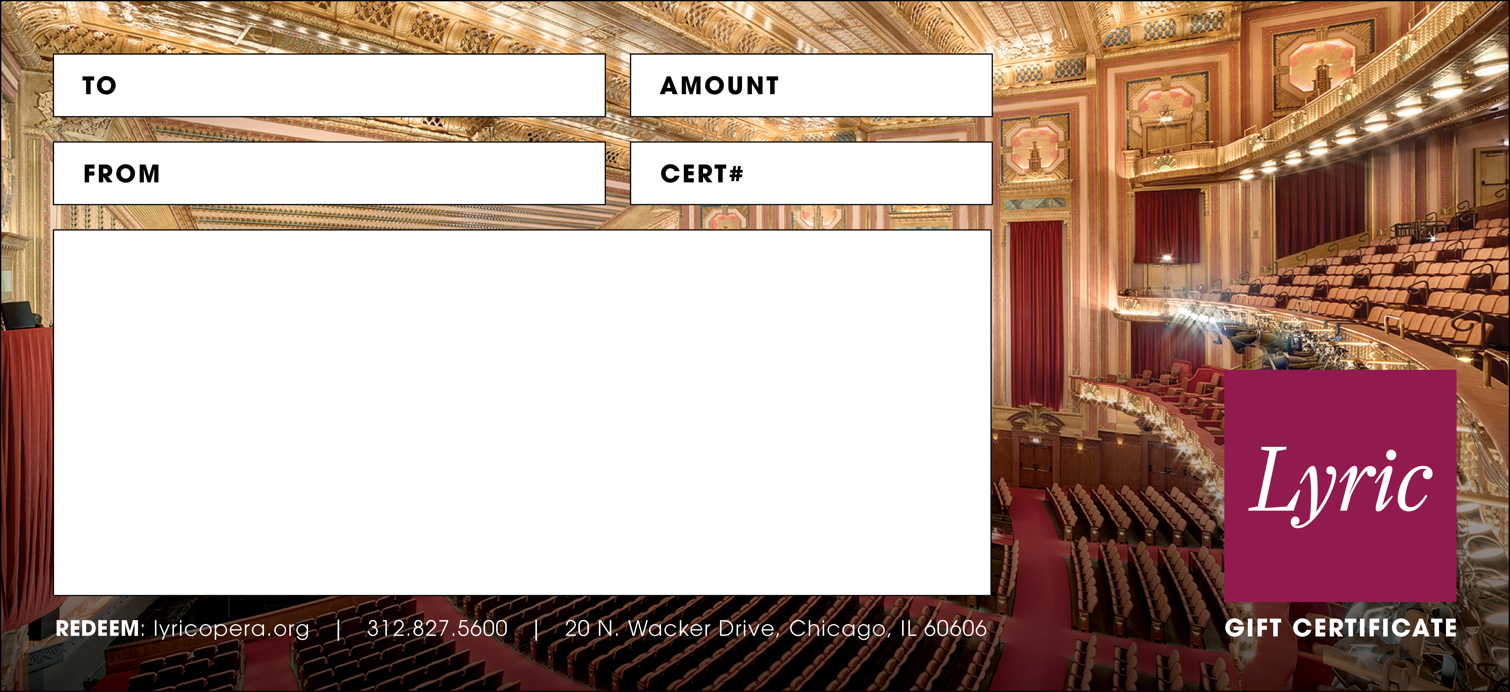 Available in any denomination, with your choice of one of eight customized designs, Lyric Opera gift certificates make the perfect gift for well-versed opera lovers and newcomers alike.