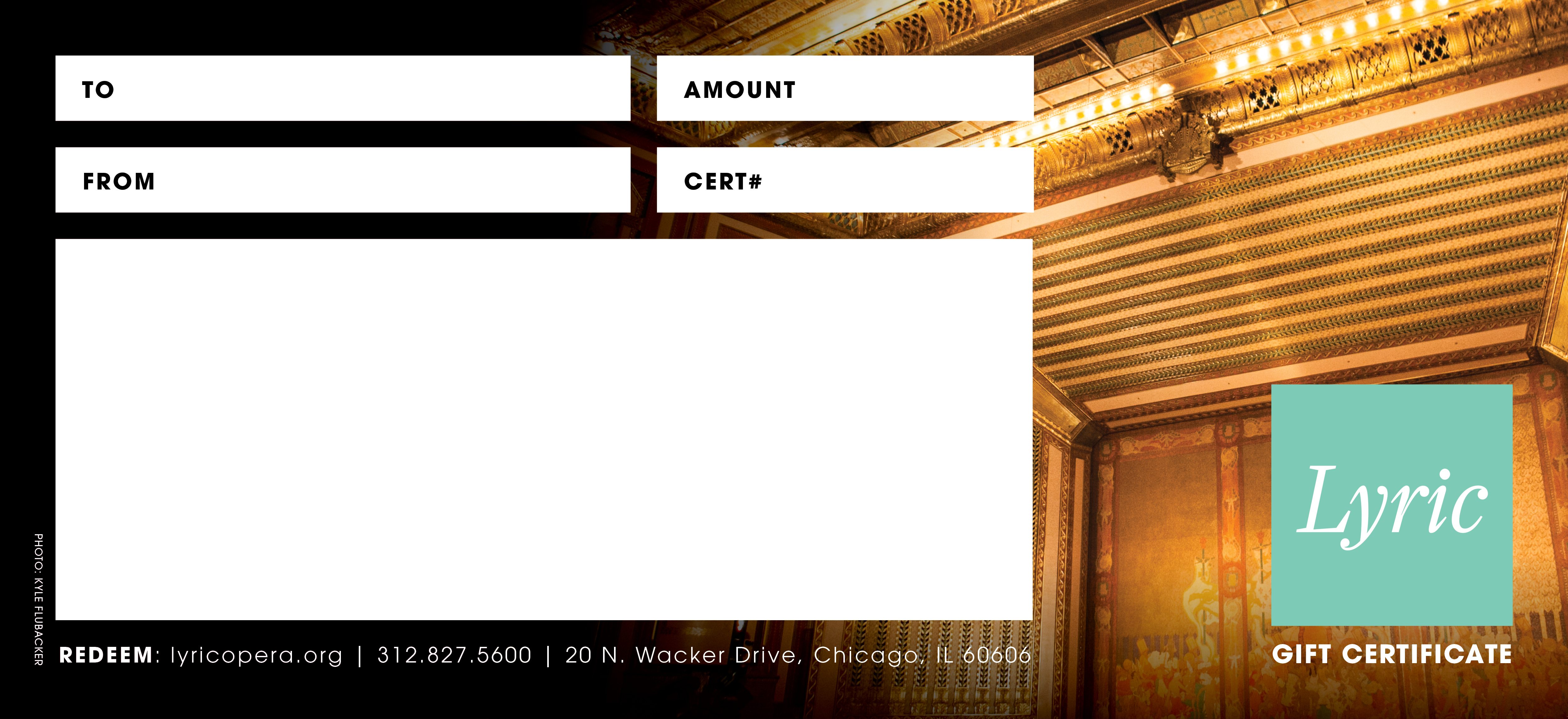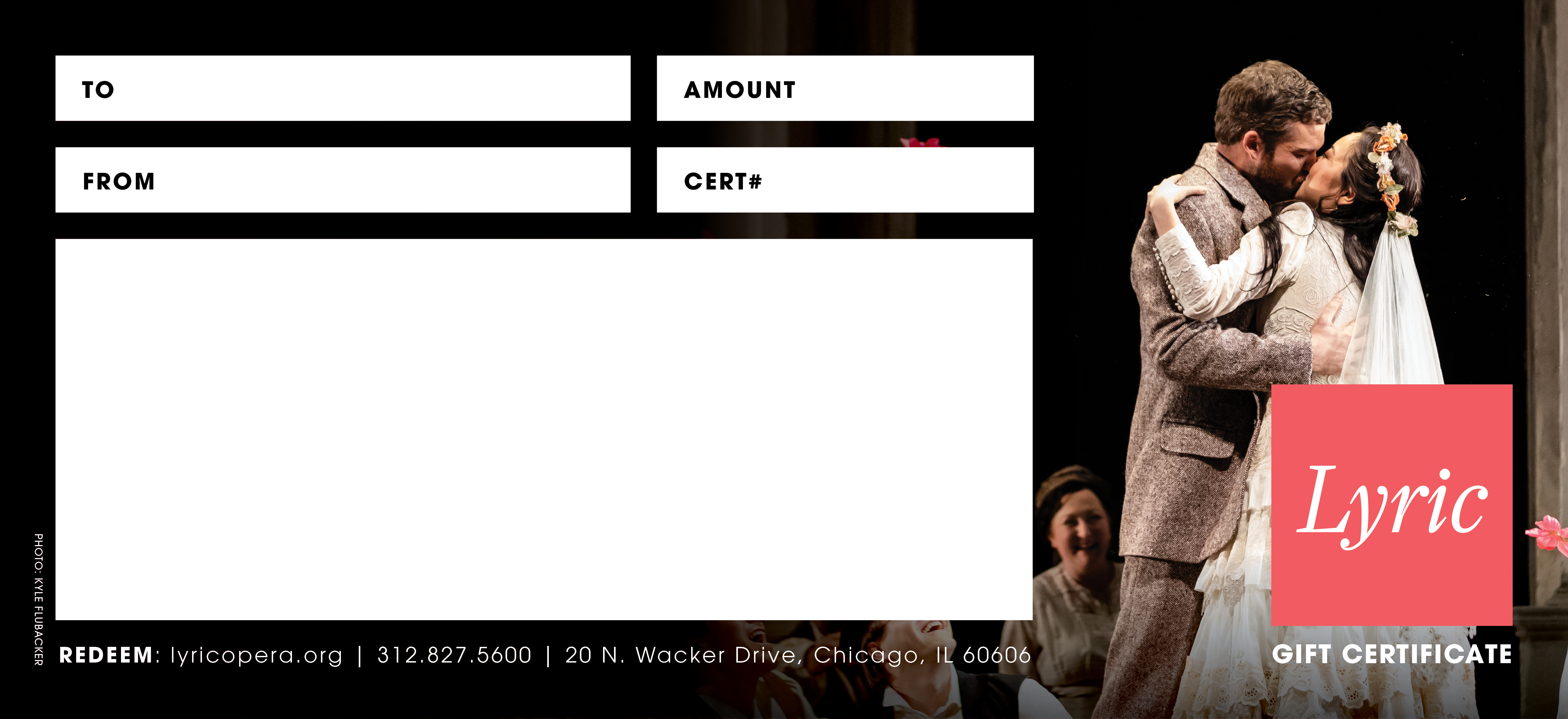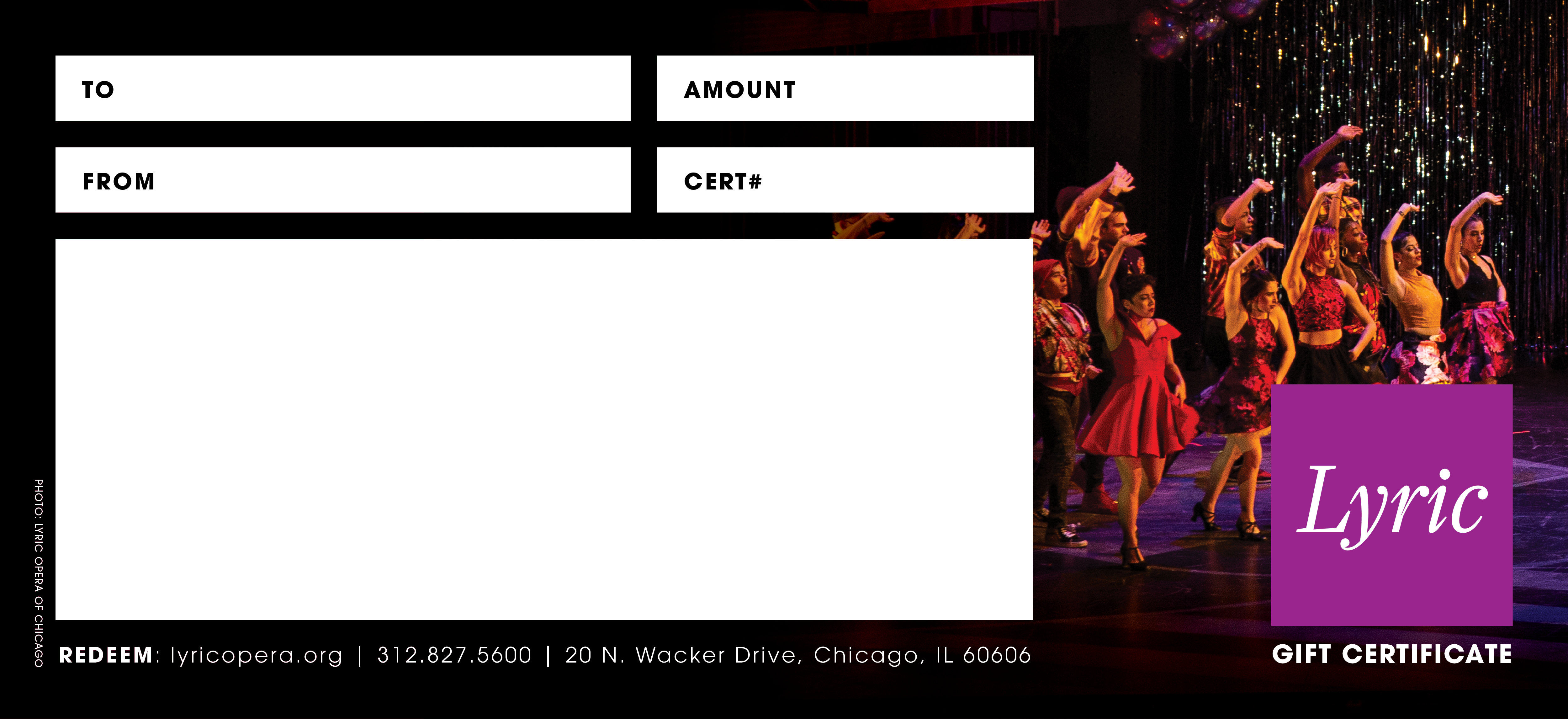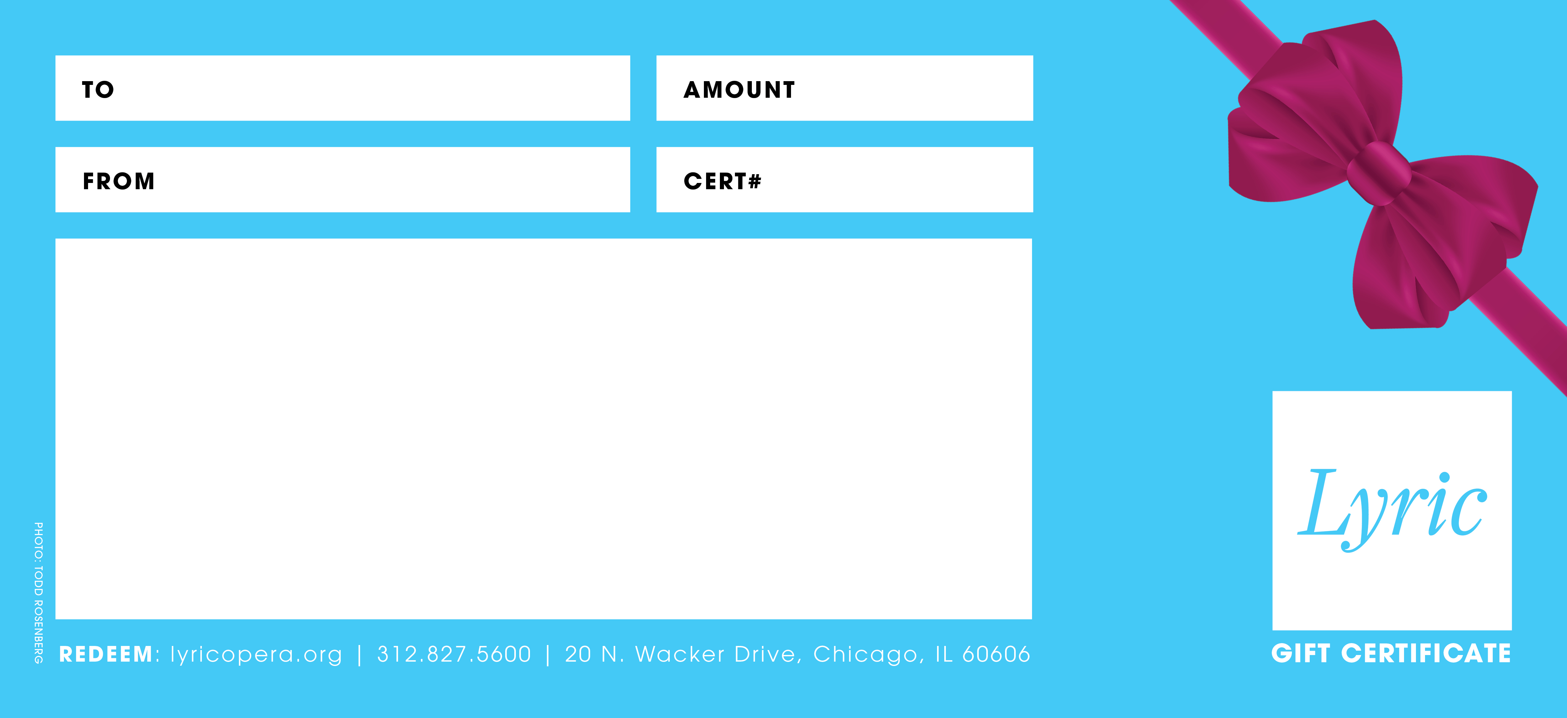 Available in any denomination, with your choice of one of eight customized designs, Lyric Opera gift certificates make the perfect gift for well-versed opera lovers and newcomers alike.