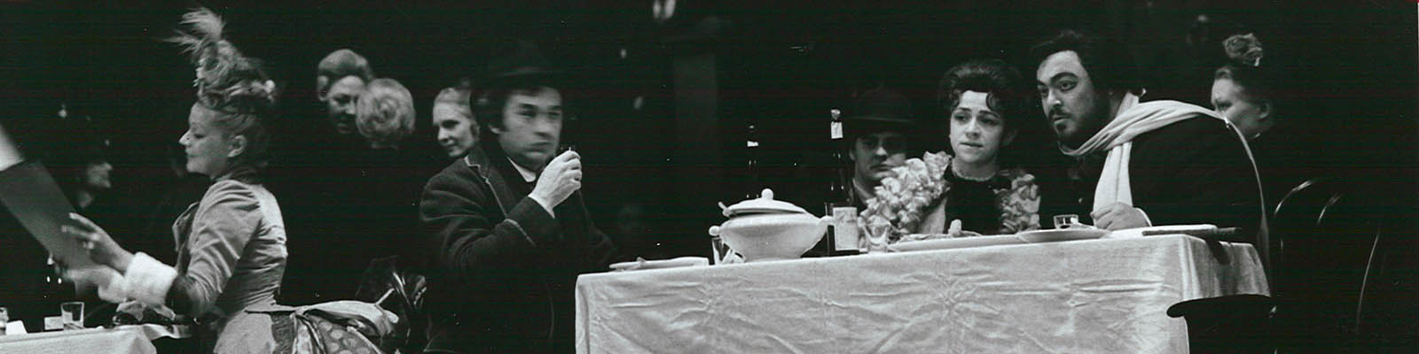 Photo: Elena Zilio (Musetta), Julian Patrick (Marcello), Ileana Cotrubas (Mimì), and Luciano Pavarotti (Rodolfo) in La bohème. c David H. Fishman.