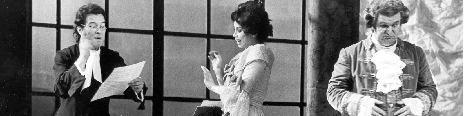Luigi Alva (Count Almaviva), Maria Ewing (Rosina), and Claudio Desderi (Bartolo) in Il barbiere di Siviglia. c Tony Romano.