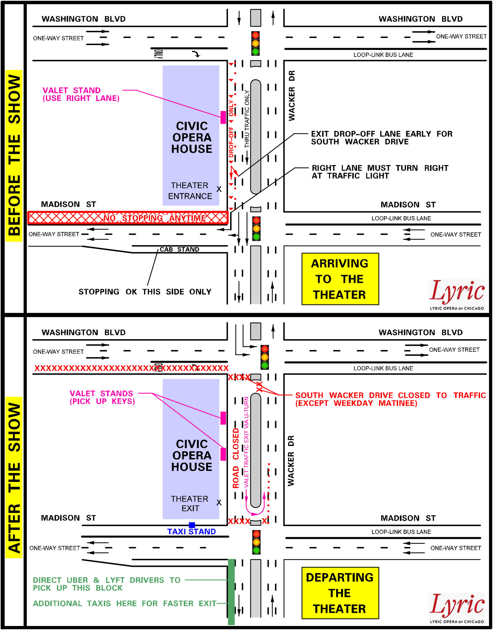 Taxi Users: Lyric Opera Taxi stand will remain the same and patrons should continue to use the Madison Street theater exit and line up in the lobby. Additional taxis will be waiting on Wacker Drive just south of Madison Street for a quicker egress if desired.